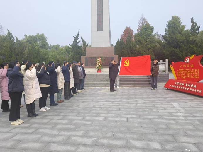 默哀结束后,高伟带全体党员面向党旗,齐举右拳,共同重温入党誓词。 铿锵有力的誓言回荡在烈士陵园上空,彰显着党员们不忘初心、牢记使命的坚定信念。