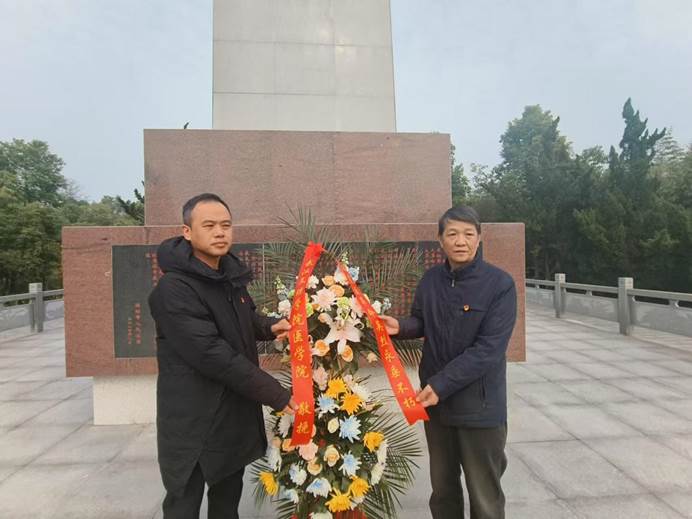 上午,全体师生党员怀着崇敬的心情抵达洪湖瞿家湾烈士陵园。园内松柏环绕,庄严肃穆,烈士纪念碑巍峨耸立,仿佛在诉说着往昔的英勇事迹。在纪念碑前,师生党员们整齐列队,庄重的缅怀先烈仪式开始。在艾永循、高伟代表师生党员献上花篮后,大家低头默哀,鞠躬致礼,深切表达了对革命先烈的无限缅怀与崇高敬意。