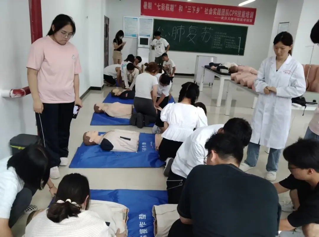 6月21号,三下乡和七彩假期两支社会实践队伍进行心肺复苏的实操训练。