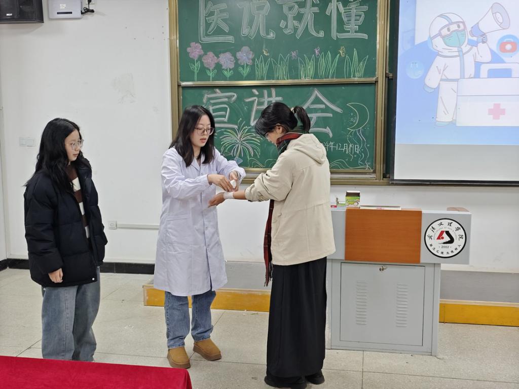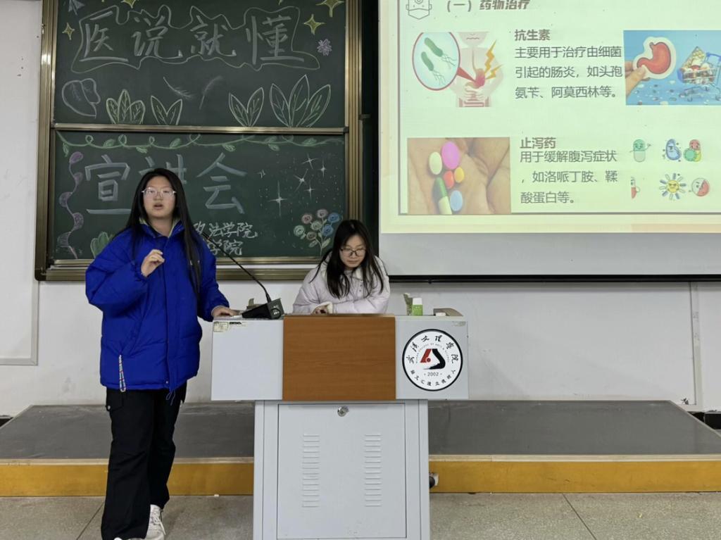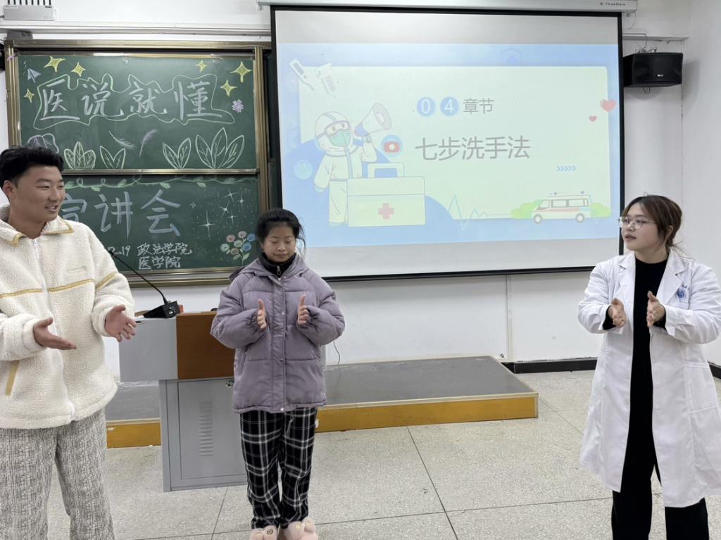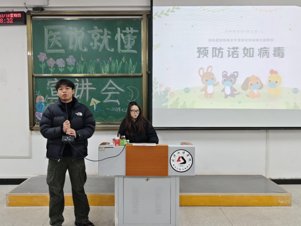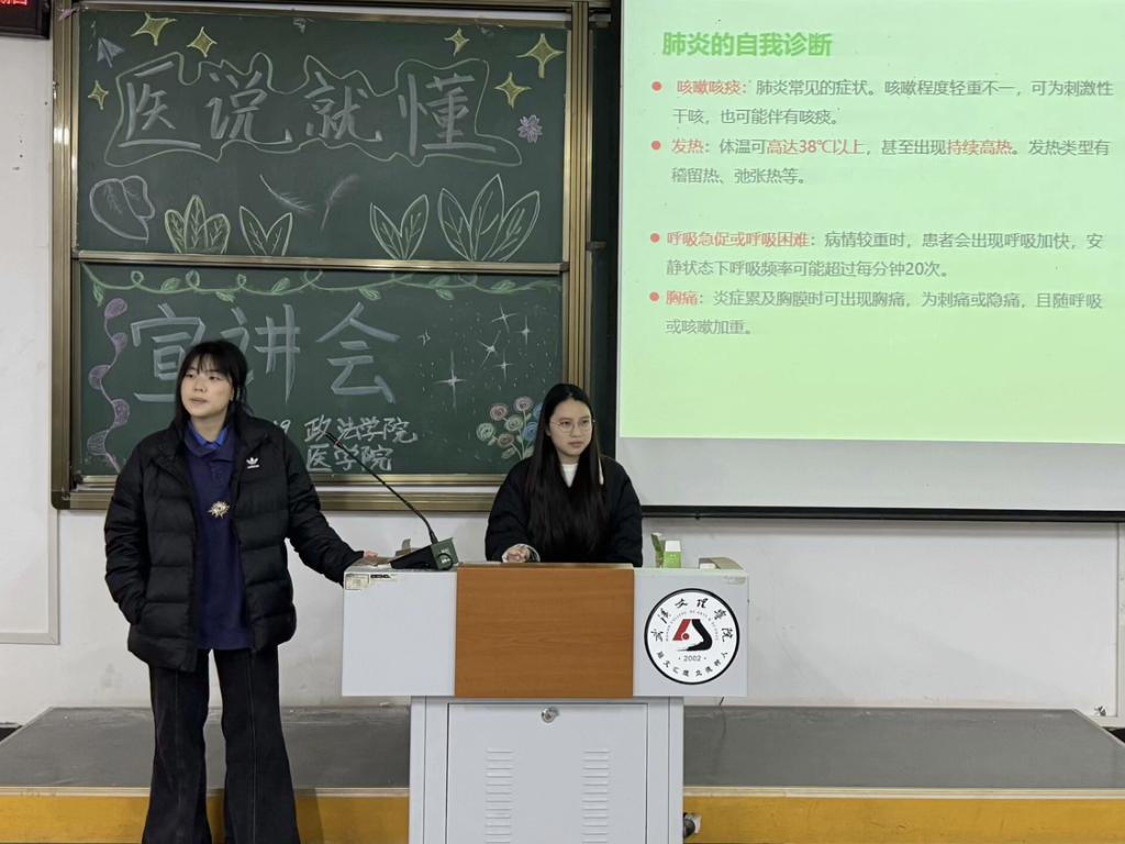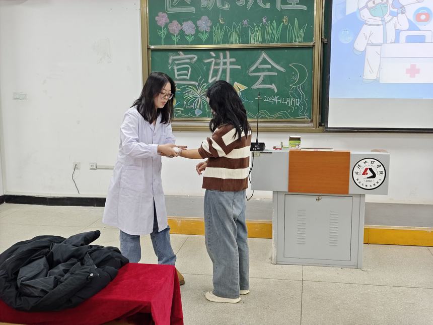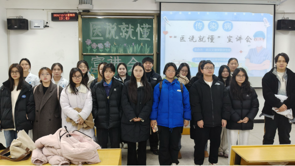 2024年12月19日晚,yl6809永利集团为响应校学生处关于切实做好校园传染病防控工作,提高师生对医学认知掌握和自我防护能力的号召,yl6809永利YL集团yl6809永利集团“医说就懂”宣讲团队在校5-124、5-125面向政法学院263名2024级新生开展主题为“普及医学常识,守护健康生活”的宣讲会。舒心粤,胡熔熔、胡媛媛、刘连籽桐、曹雨欣、周婧、蓝晨、李灿、陈颖、刘星宇、孙嘉遥,曾德妃组担任宣讲人。