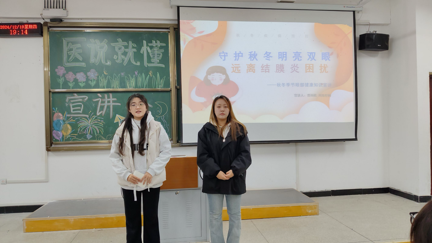 刘连籽桐,曹雨欣为大家详细讲解结膜炎的类型、病因、症状、预防措施和眼部护理技巧。她们指出,结膜炎虽然常见,但只要采取正确的预防措施,就能有效降低感染风险。现场同学们热情提问互动,进一步加深了对结膜炎知识的了解。