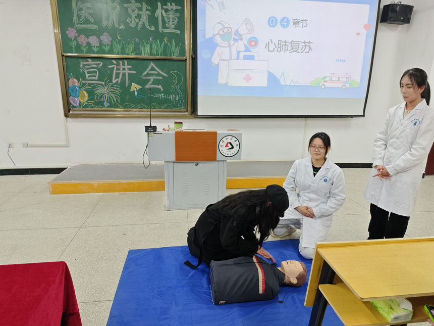 蓝晨,周婧宣讲介绍心脏复苏术的基本原理和操作步骤。蓝晨强调心肺复苏不仅是医务人员的责任,更是每个公民都应该掌握的救命技能。现场,蓝晨,周婧演示正确的心肺复苏方法,学生们积极响应并上台互动参与实操教学。