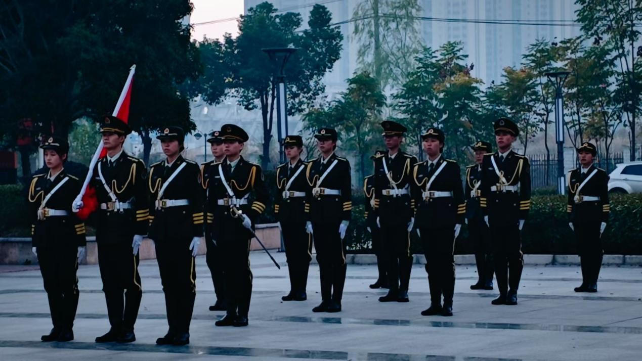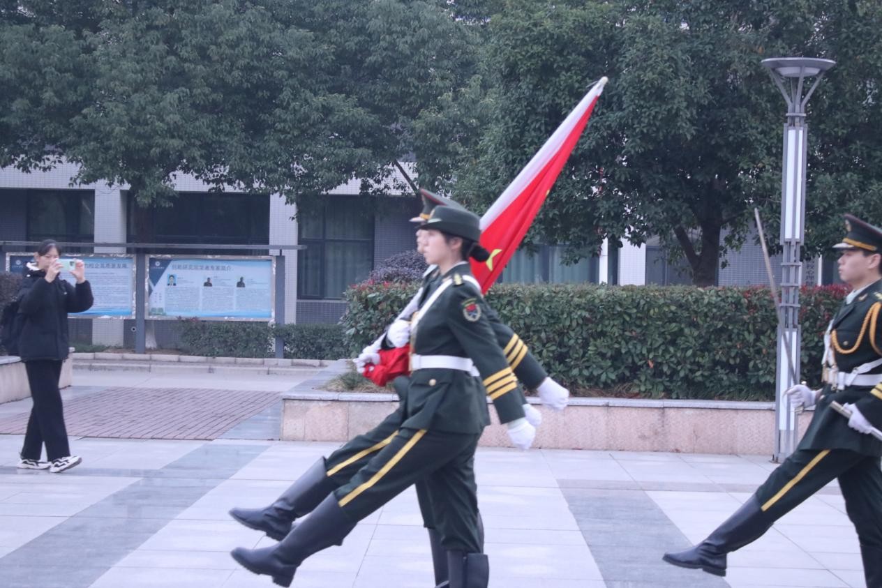 当清晨的第一缕阳光洒在校园,国旗护卫队的同学们迈着整齐有力的步伐,护卫着五星红旗走向升旗台。他们身姿挺拔、目光坚定,每一步都彰显着青春的朝气与对国旗的敬重。