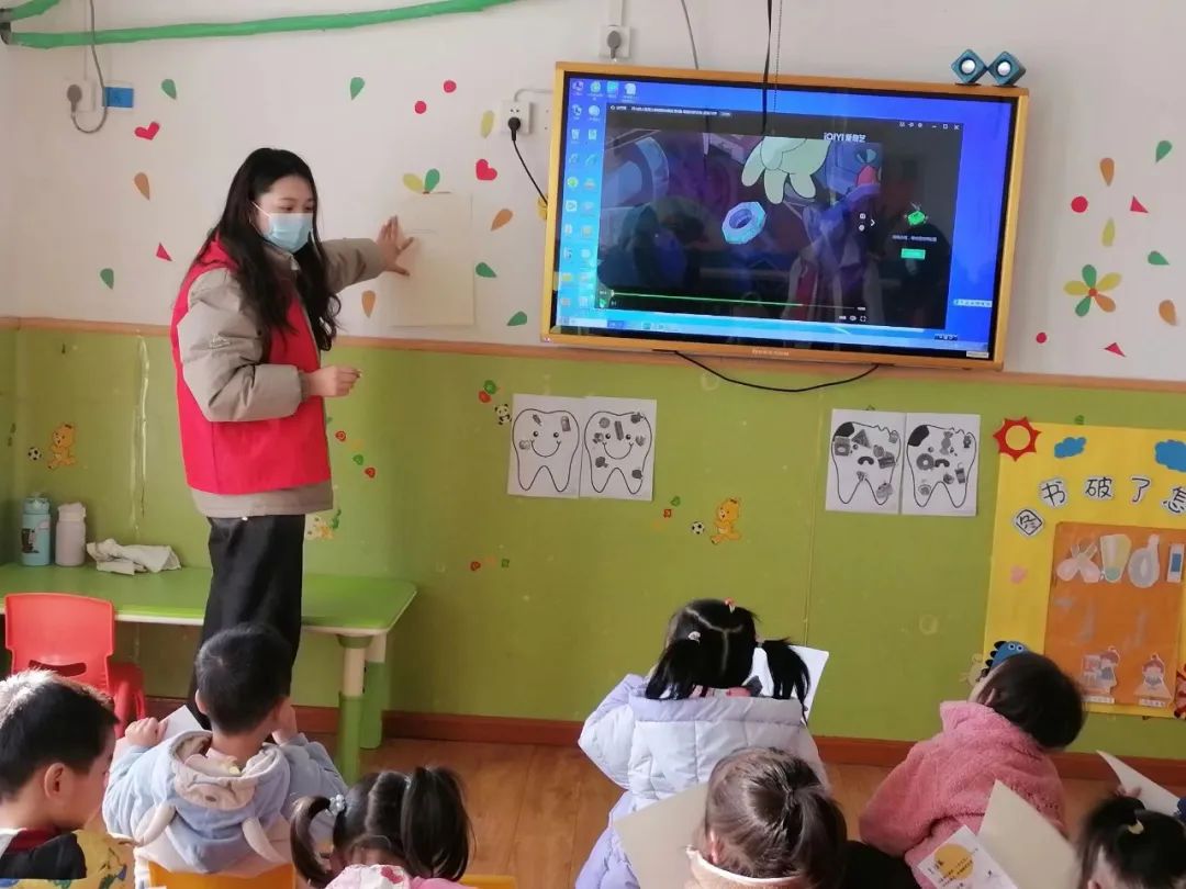活动中,志愿者结合有趣的护牙小常识、牙齿模型和图片、食物图片和蜡笔等物品,从牙齿的结构、蛀牙的形成、如何保护牙齿三部分,以生动活泼的形式向孩子们讲述牙齿的故事。