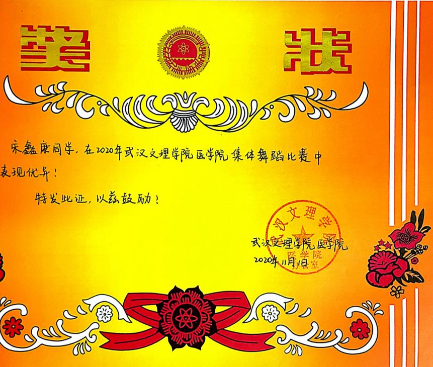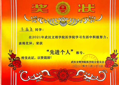 宋鑫康的学习成绩从大一成绩年级第四到大二、大三学年成绩年级第一,综合成绩和专业成绩第一。三年来,他连续两年荣获一等奖学金、优秀学生干部标兵称号,精神文明奖,连续三年荣获“优秀学生干部”称号。2022-2023学年,宋鑫康因学习成绩突出荣获校“和润单项奖”。