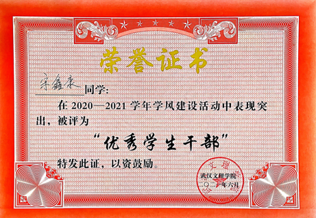 在学风建设活动中,他荣获优秀学生干部、先进个人、优秀共青团员、优秀志愿者、突出贡献者等奖项。
