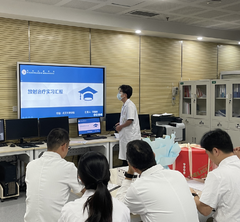 2023年8月,在武汉中南医院肿瘤放化疗科实习阶段,他又作为优秀实习生代表向带教老师做实习经验汇报。