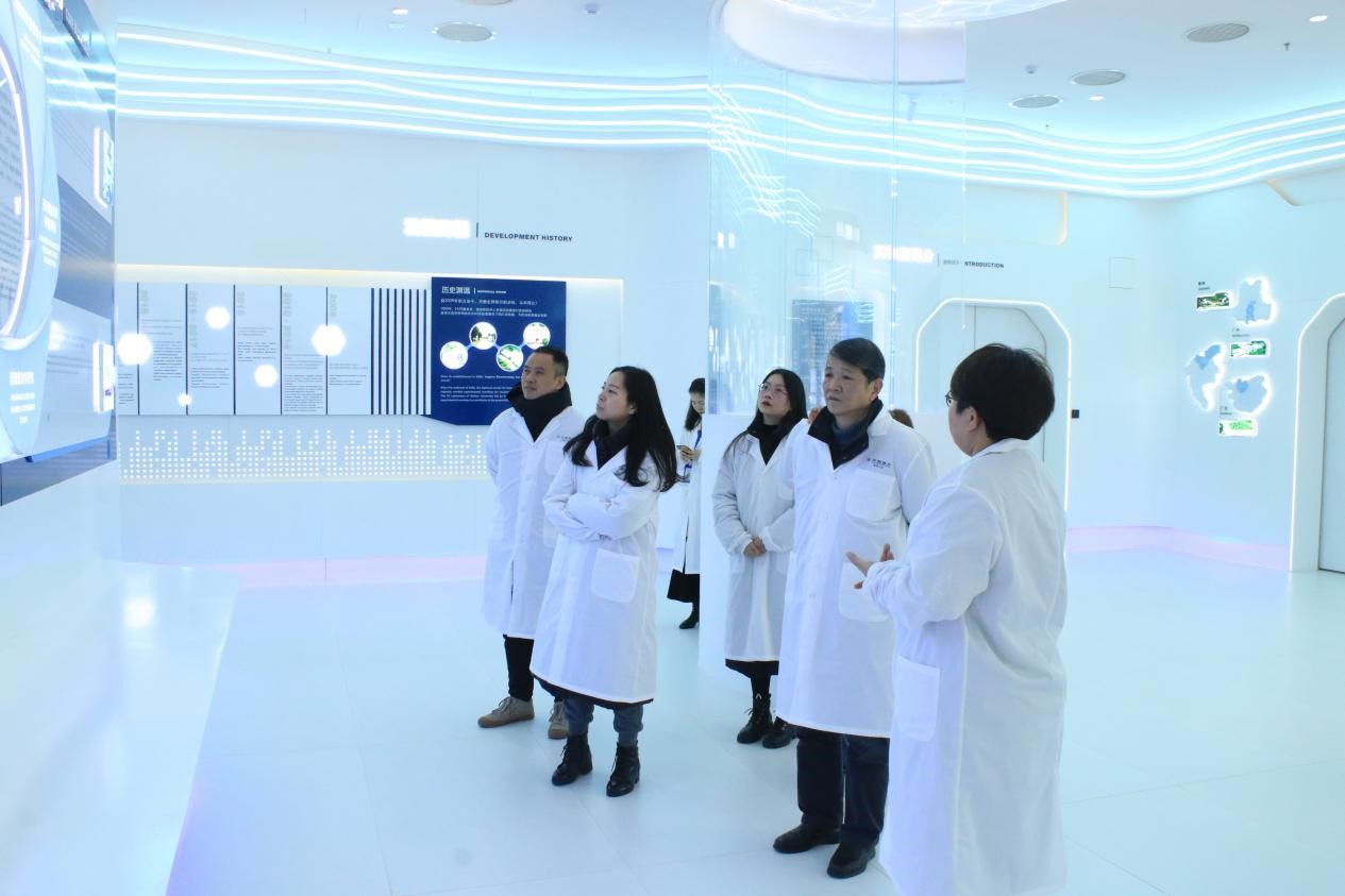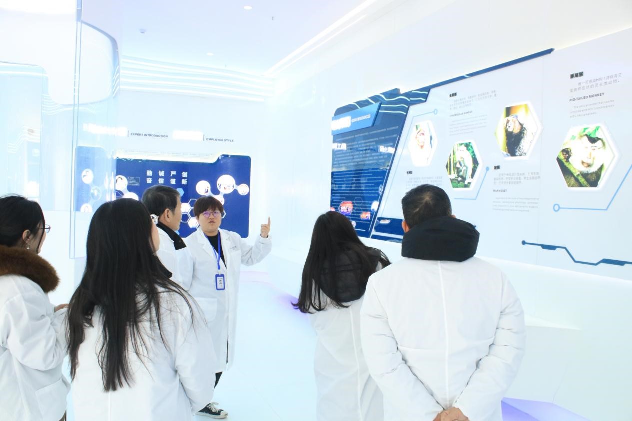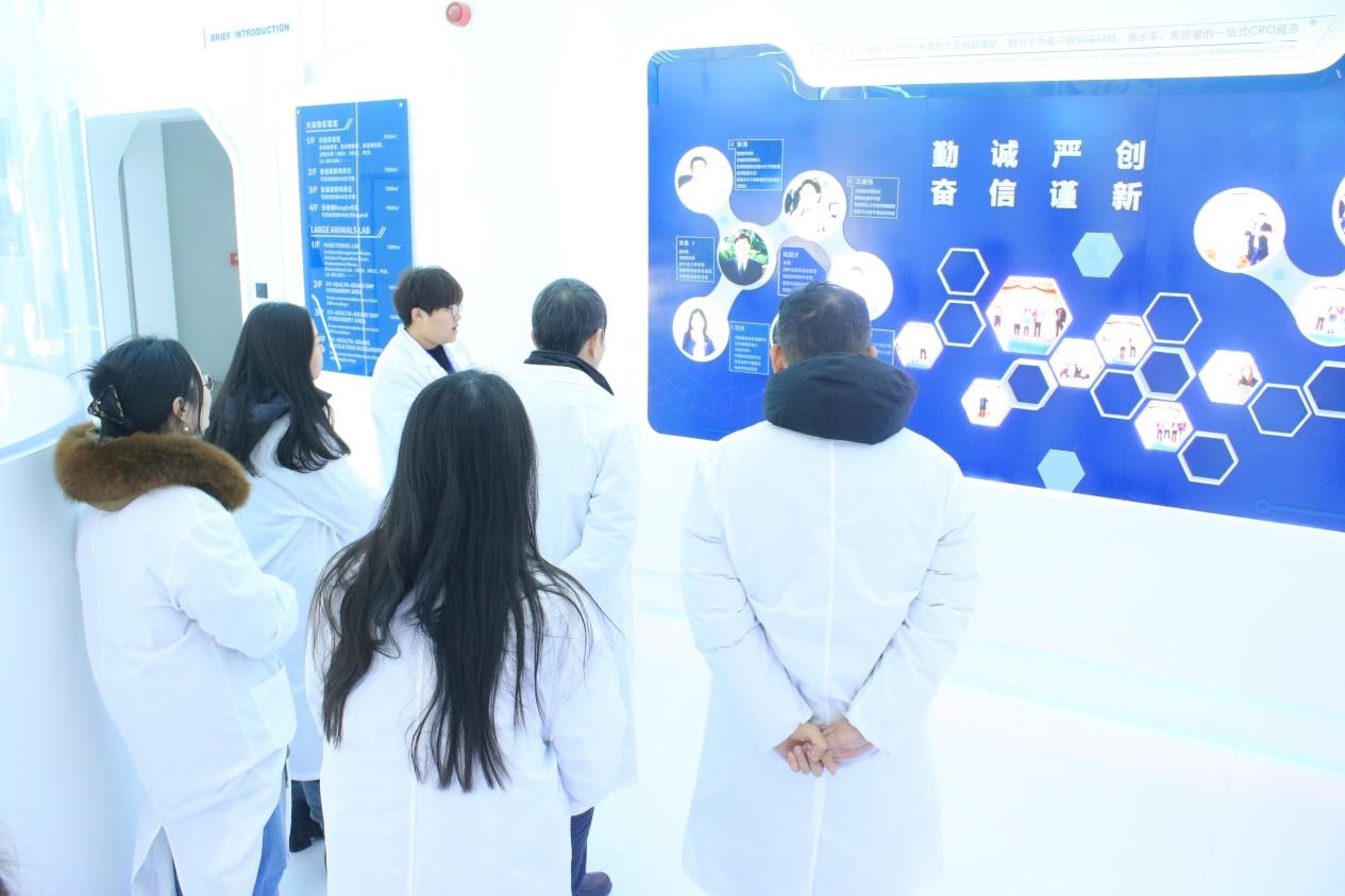 艾永循副校长一行参观文化墙,田园总监介绍天勤生物发展史、研究领域、知名专家等相关情况