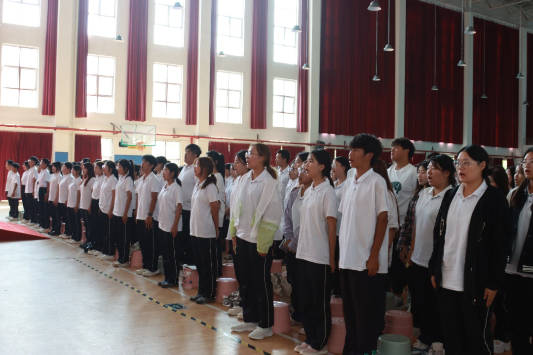 伴随着雄壮嘹亮的国歌伴奏,全体师生激情满怀,齐声合唱,开学典礼拉开帷幕。