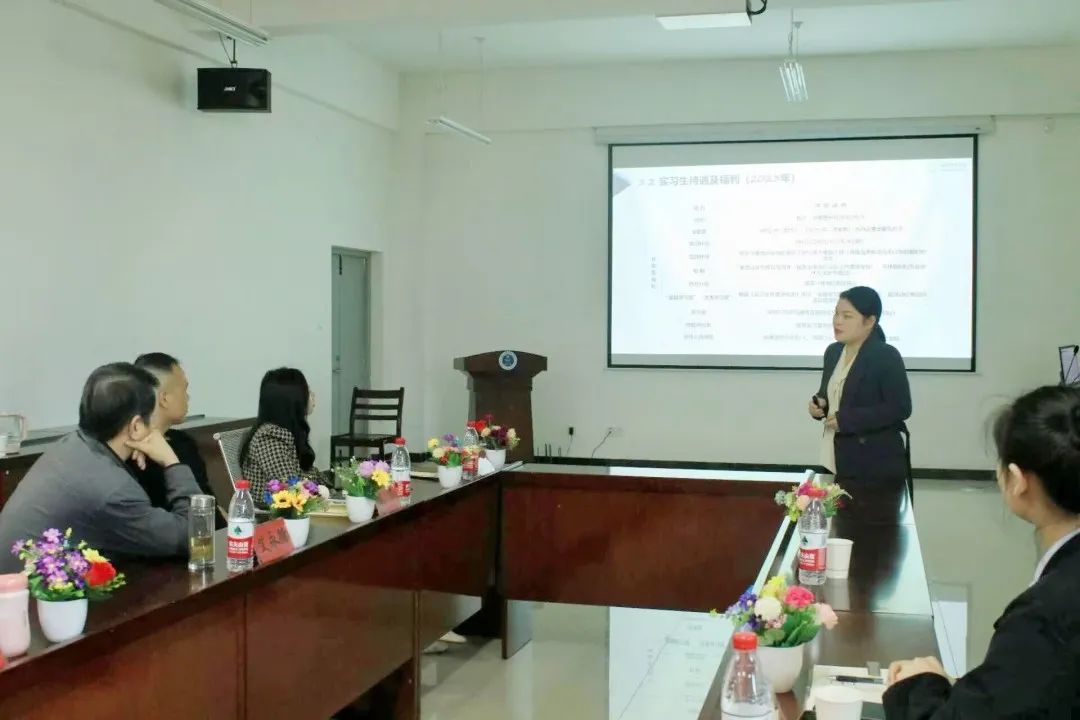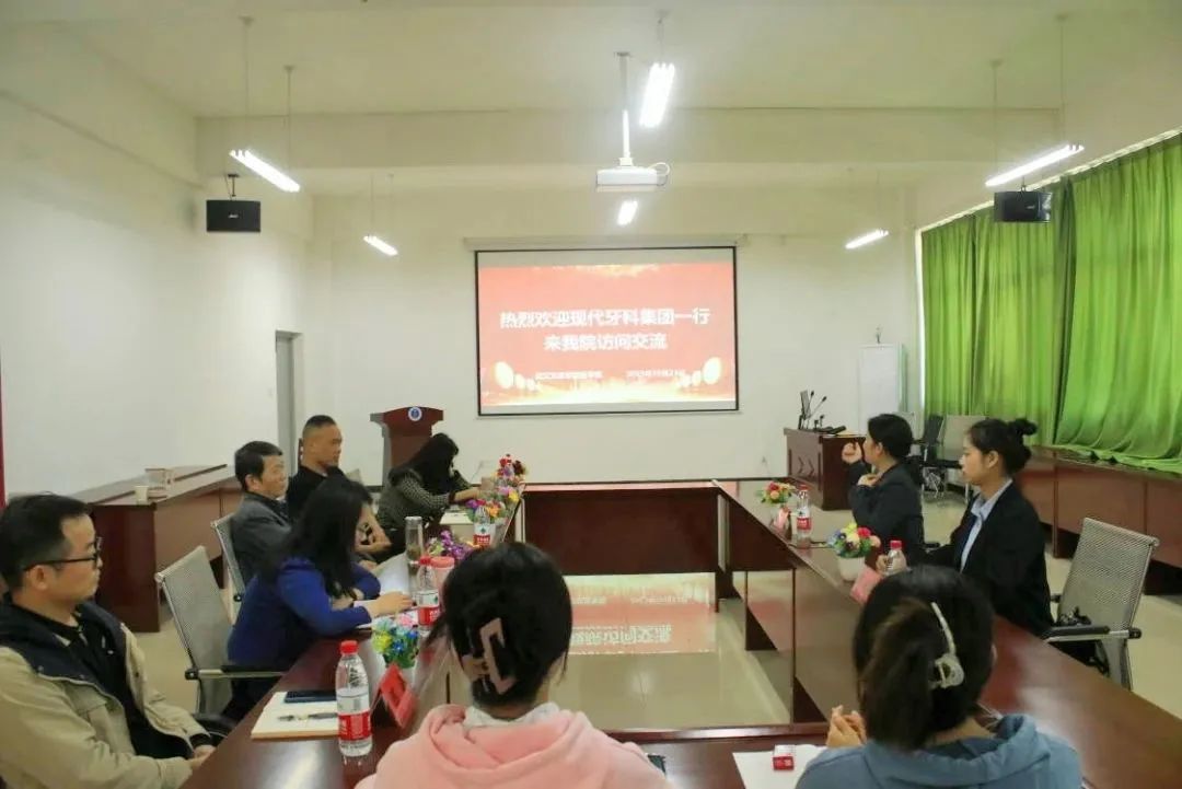 会议伊时,曹晓婷主任对现代牙科集团旗下的现代牙科技术(东莞)有限公司的师资力量、教学设施、教学管理、员工薪资待遇、企业文化等基本情况做了介绍。她表示现代牙科集团是一家专业从事义齿研发、生产、培训、销售及服务为一体的国家高新技术企业,有着与众多高校合作的经验,强烈表达了现代牙科集团与我校展开校企合作的愿景。