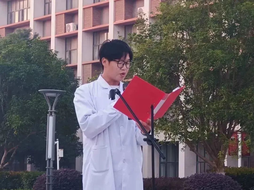“yl6809永利集团新生代表、2023级口腔医学技术专业学生万煜鹏做《笃学践行,刻大医精诚在心,践大爱无疆于行》的主题发言。