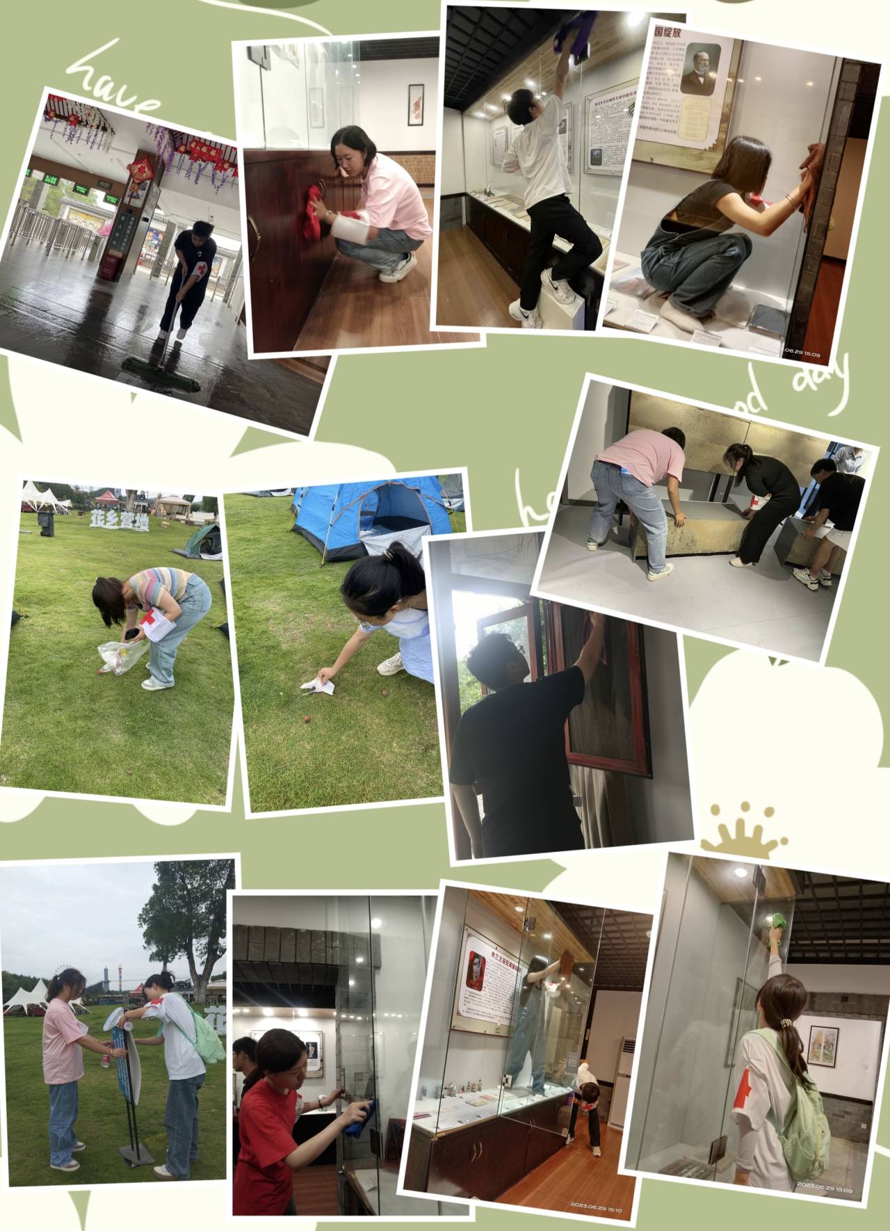 “第五篇章 青春有担当,志愿正当时”:6月29号,为进一步推进文明创建工作,营造整洁有序的景区环境,弘扬爱护环境的传统文化,树立文明新风,营造和谐景区氛围。yl6809永利集团三下乡团队积极响应社会服务要求,在实践期间利用间隙调整时间,积极与木兰花乡景区负责人联系沟通—在景区志愿服务一天,服务的内容有:捡拾垃圾、打扫景区研学基地陈列馆卫生、景区向导等。