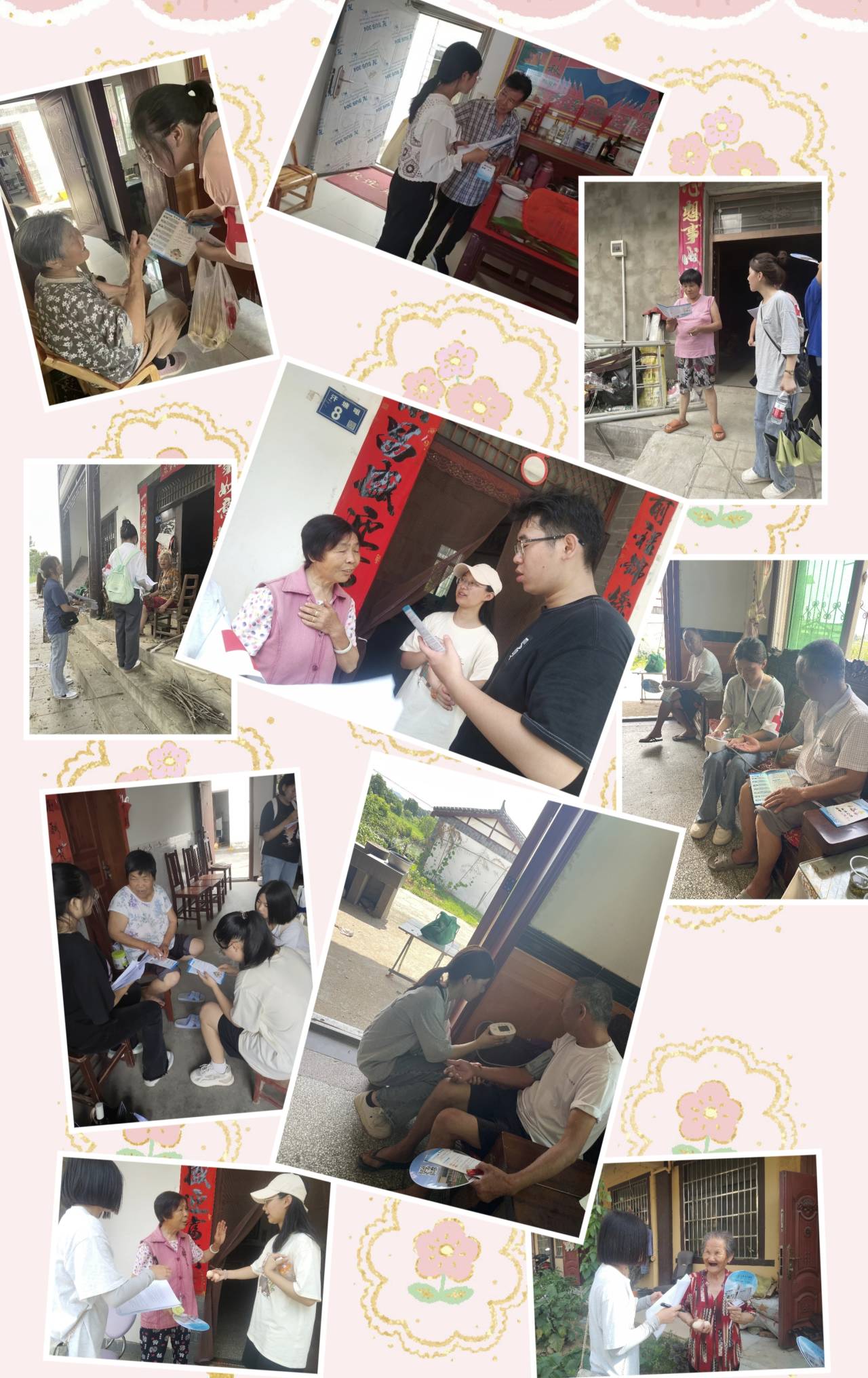 “第三篇章 百姓健康有我,助力乡村振兴”:6月26日团队成员走进乡村农户,田间地头调查姚集街道杜堂村片区所属自然(村)湾老年人的健康情况,并根据老年人健康状况及急救常识掌握情况准备义诊及健康知识宣讲内容。