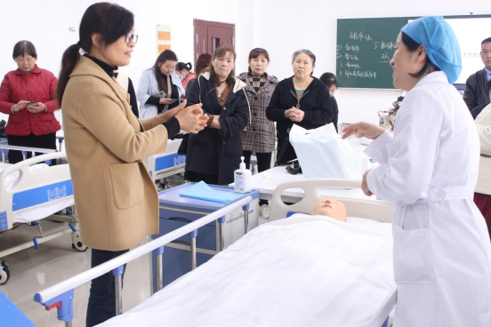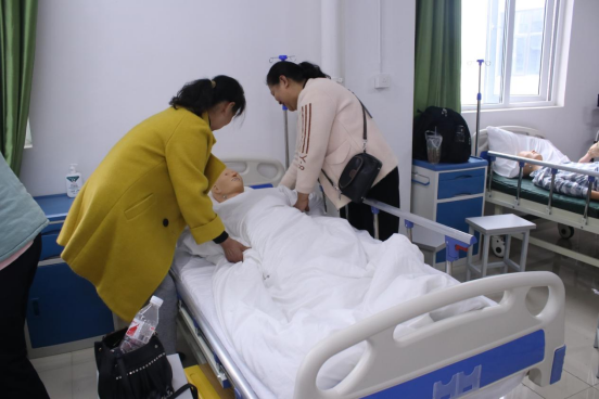 开班仪式结束后,学员们在教师曹佑梅、张羚月的带领下在6 -425实验室开展了首周的培训课程。这里的每一处布置彰显着学院的专业性与责任感。首批50名学员将在这里开展为期80个学时的临床技能操作培训,开启理论与实操相结合的学习之旅。通过培训并通过考核的学员将获得湖北省卫健委颁发的“医学护理员资格证”,成为推动湖北省临床陪护行业的中坚力量。