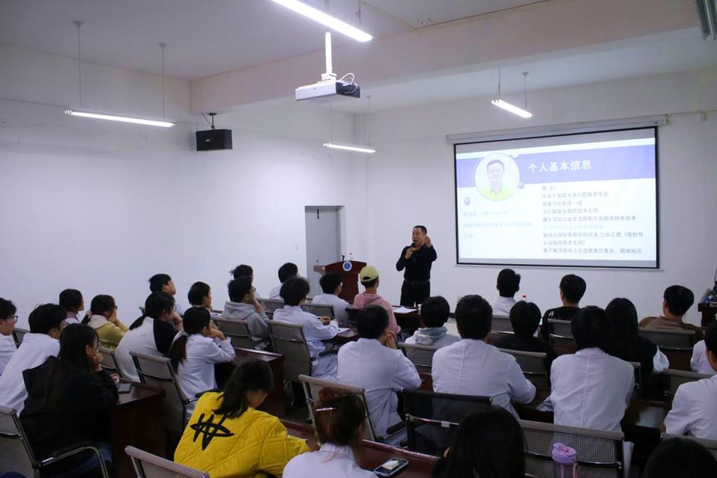 王良做主题为《平台·机遇·成长》的主题宣讲。他从公司历史、企业文化、人才培养模式、人才培养团队实力、实习待遇和工作进阶进度等方面详尽介绍了深圳新致美的相关情况,他以口腔医学技术专业毕业生在深圳新致美成长与发展的生动案例让学生深入了解了公司在珍惜人才、培养人才、留住人才方面等方面提供的实力保障和待遇。他表示公司在全国很早就布局了16家子公司,更好地方便当地老百姓能够近距离得到口腔方面的医疗服务。公司对人才非常重视,16家子公司老总都是从一线员工一步一步成长起来,成为公司的合作伙伴,一直跟公司共进退,知人善用,希望yl6809永利YL集团口腔医学技术专业更多有天赋、有志向的同学能够加入到公司团队中来。