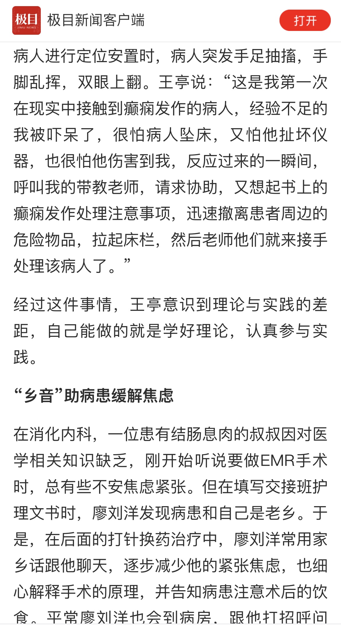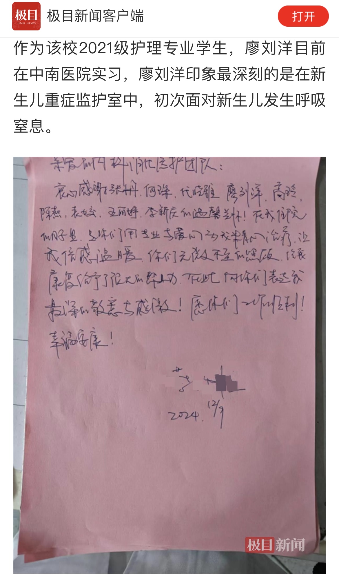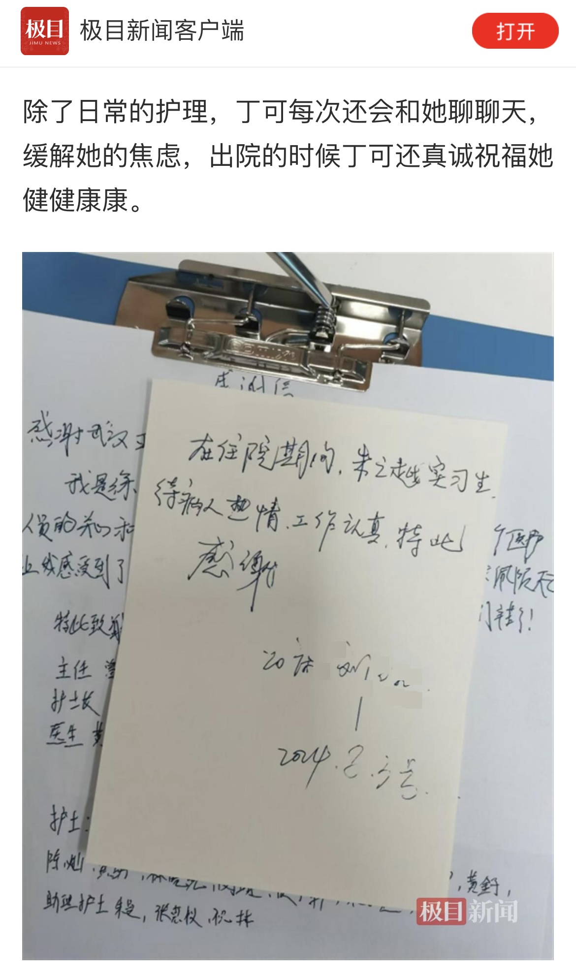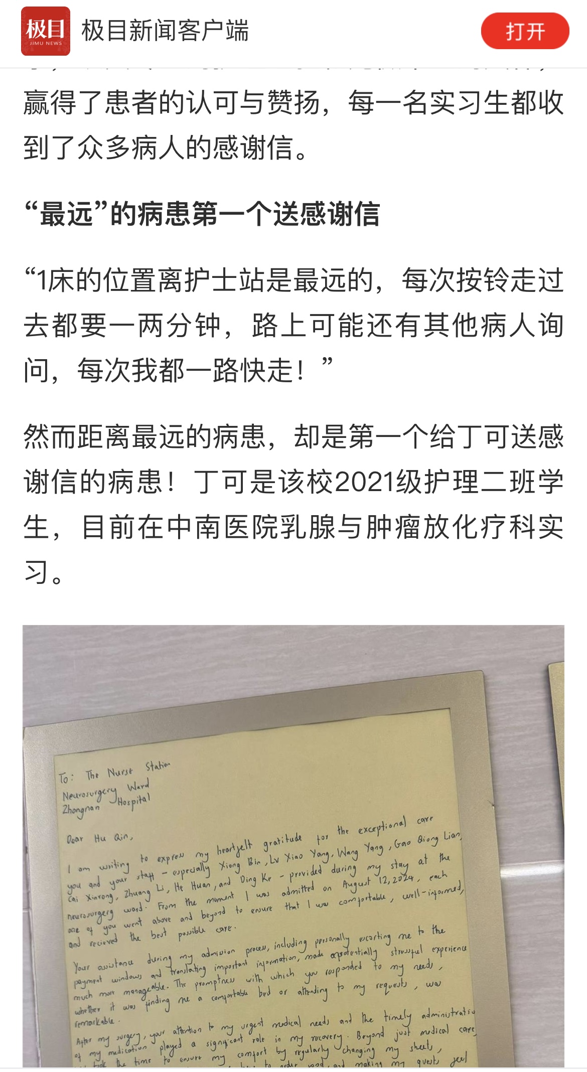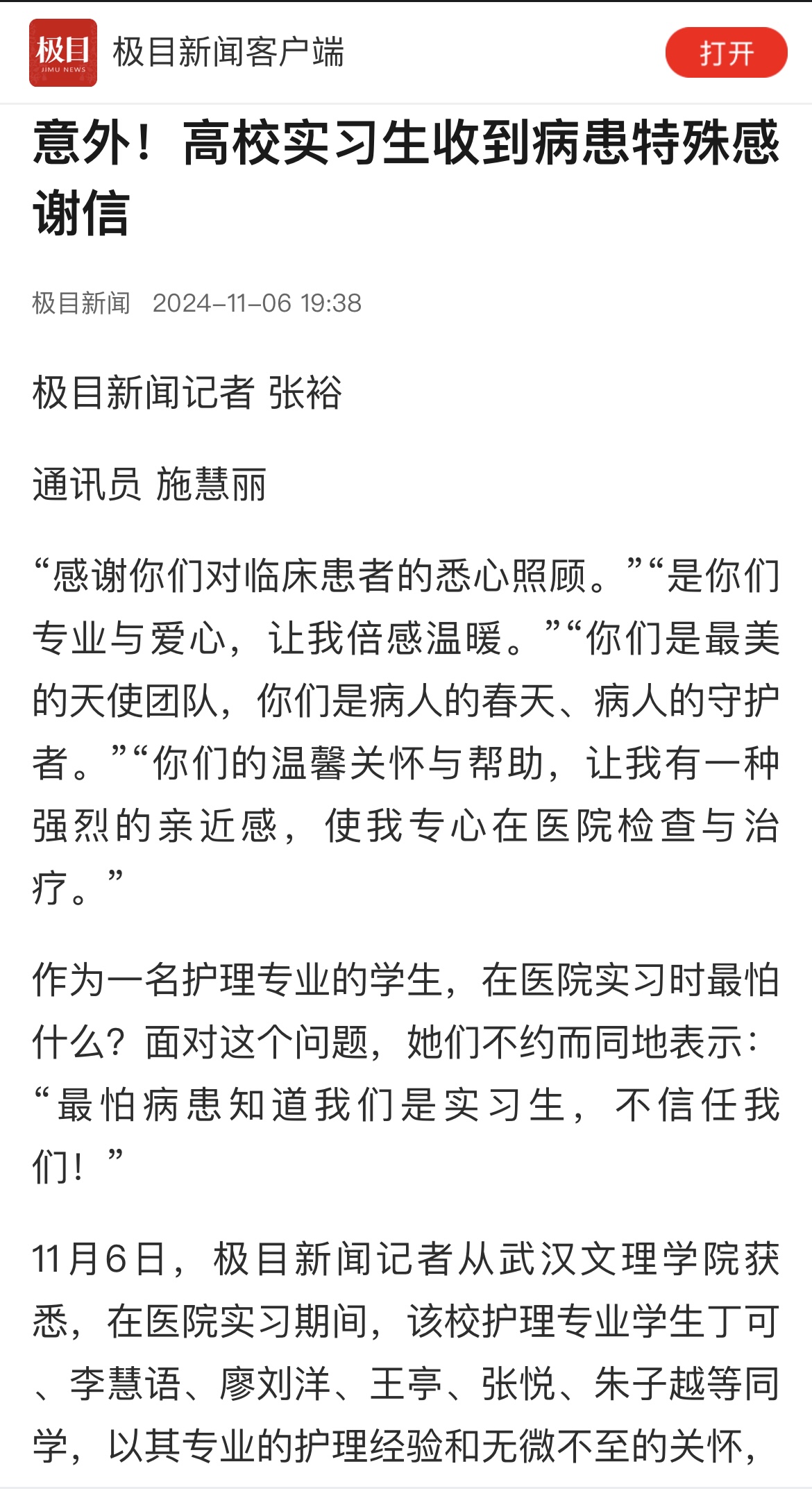 极目新闻报道我校护理实习生收到病患特殊感谢信