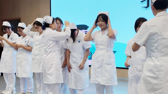 现场实习授帽环节将活动推向了高潮。22级护理实习学生代表身着护士服,一次排开站在台前,护理系教师他们戴上象征着护理职业神圣使命的护士帽。轻柔的动作、庄重的神情,传递着护理前辈对新一代护理人的殷切期望,也让在场的每一位同学感受到了护理职业的崇高与责任。