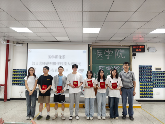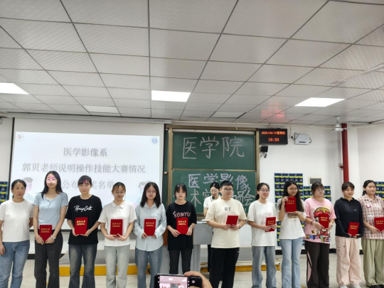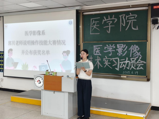郭贝总结回顾医学影像技术系2025年医学影像技术操作技能大赛举办情况,总结和点评了参赛学生的出色表现,号召全体同学能够以本次比赛为起点,以良好实操能力和个人表现在实习中获得更大成绩。现场举办了本次技能大赛颁奖仪式。