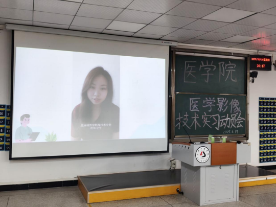 现场连线播放了武汉汉阳医院放射科主任左敏的实习动员和邀约讲话以及优秀实习生代表、华中科技大学附属梨园医院工作的徐金超和2025届医学影像技术专业毕业生刘运婷的实习工作经验分享。医院领导和学长学姐的真挚祝福和动员引起了现场同学们的强烈共鸣,为他们注入了满满的信心与动力。