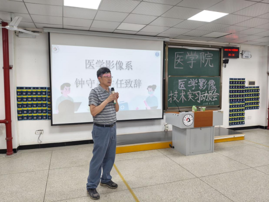 钟守昌做动员讲话。他详细阐述了医学影像技术专业实习的重要意义与核心目标,强调实习是理论知识与临床实践深度融合的关键阶段,能够让大家在真实的工作场景中积累经验、提升专业技能,就实习期间的学习规划与职业素养培养提出了宝贵建议,鼓励同学们把握机会,主动学习,为未来的职业发展奠定坚实基础。