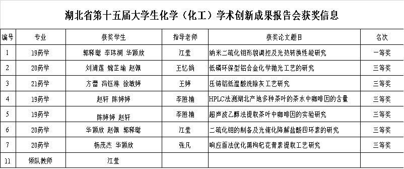 2022年6月17日-19日,湖北省第十五届大学生化学(化工)学术创新成果报告会由湖北省教育厅批准、湖北省化学化工学会主办、长江大学承办。“三宁杯”主会场在长江大学举行。经过论文报告、专家组答辩与综合评议等环节的激烈比拼,我校学子在本届赛事中表现突出,荣获一等奖1项,三等奖6项。