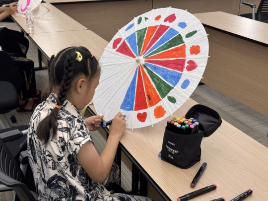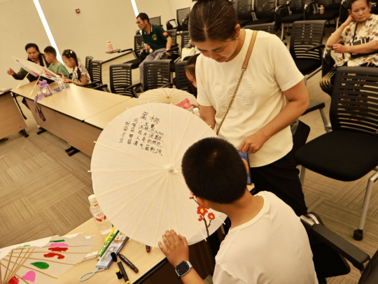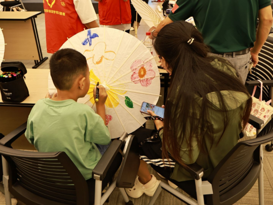 家长与孩子共同协作,现场充满温馨与欢乐。将想象化作色彩,荷花摇曳、蜻蜓点水,可爱的卡通形象跃然伞上,亲子间的温馨瞬间也定格成绚丽的图案。