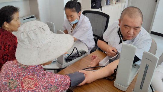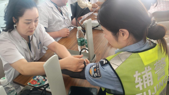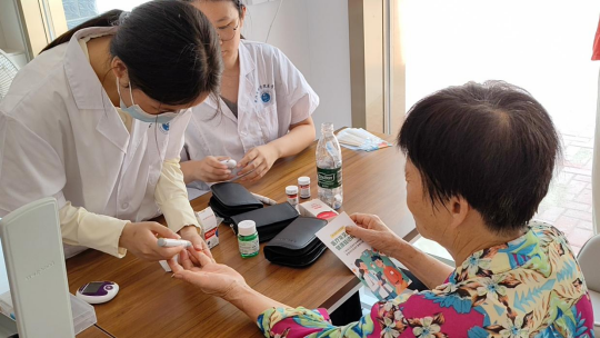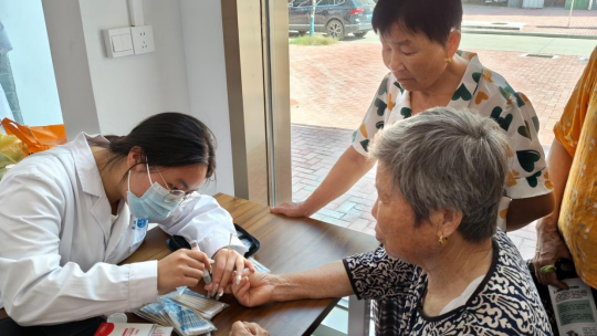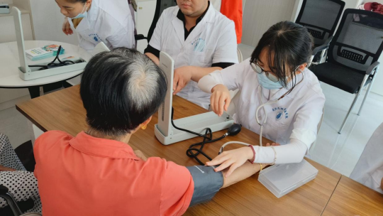 谭婧阳、曹宇、陈鹤立有序为居民测量血压、细致记录数据,针对异常指标提供个性化健康建议回答居民关于疾病预防、健康养生等问题。实践队员在三位老师的带动下,更加热情积极参与血糖监测,发放健康问卷调查以及义诊引导等工作。