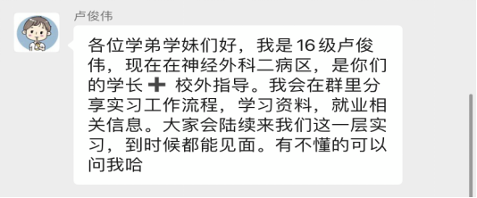 除了医院内老师的指导外,令我感受最深刻的就是卢俊伟学长带领的校外指导。由于卢俊伟学长是我们本校的学生而且也在神经外科工作,所以他更加了解我们作为第一次下临床的学生的心理感受,在自己繁忙的工作之余总是能给我们送来阵阵关心和指导。学长的关心与教导让我们这些处于陌生环境中的学生们渐渐有了安全感,更加热情的投入实习工作。