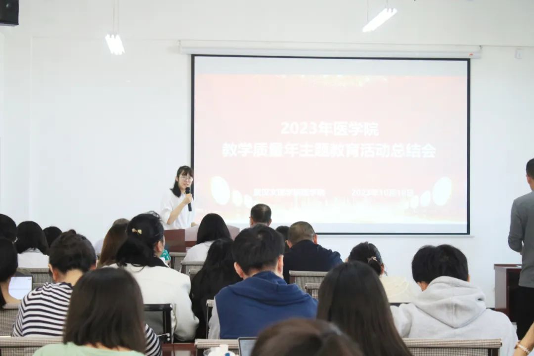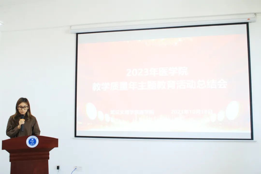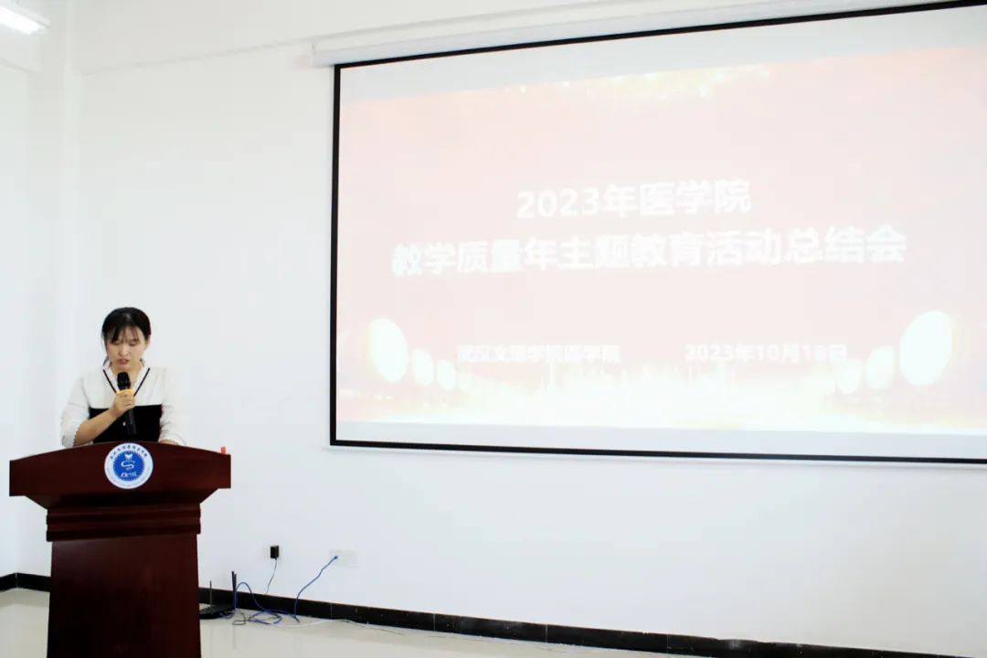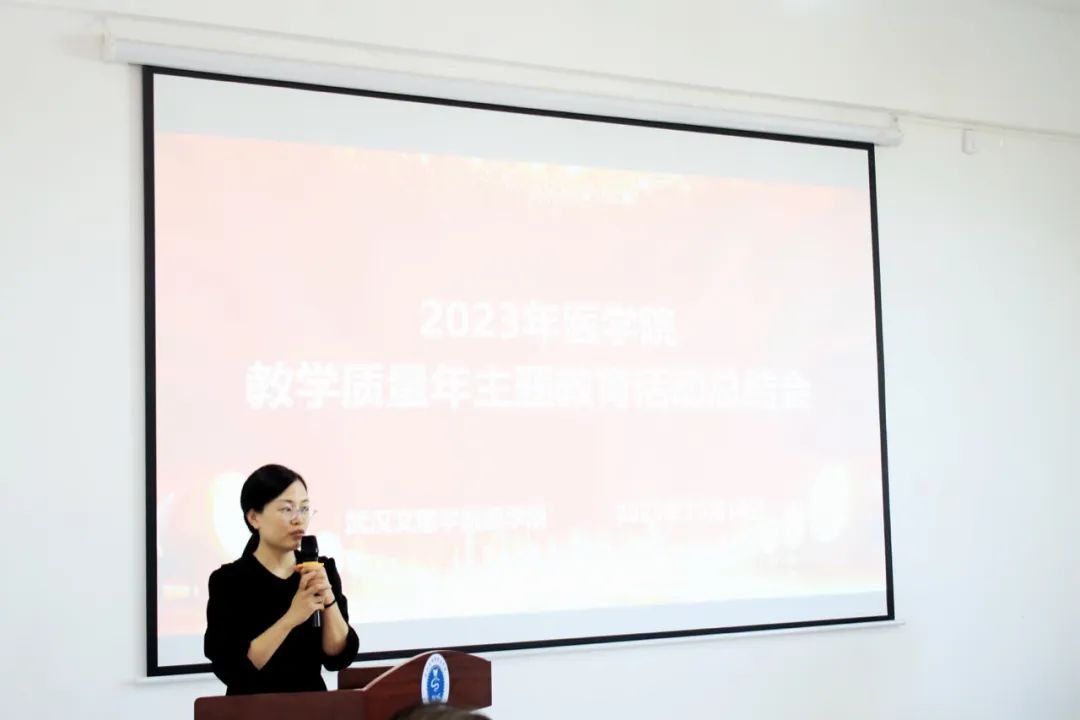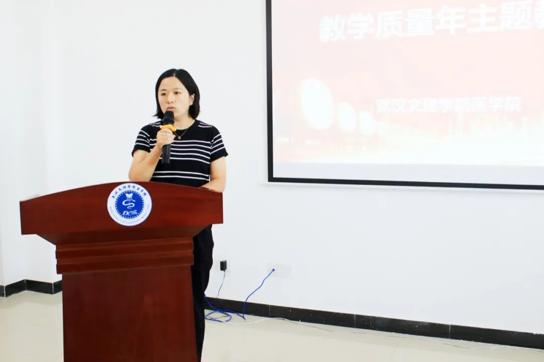 医学实验教学中心主任王婷老师发表了主题为《医学实验教学中心“提高教育教学质量年”主题教育活动工作总结》的报告。她主要从医学实验教学中心在明确实验教学中心辅助实验教学的工作职责、规范实验室管理、优化实验条件、加强师生安全保障四个方面所做的工作进行了总结。