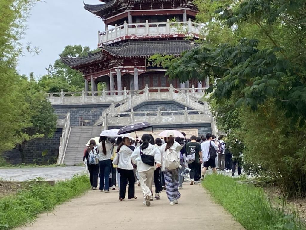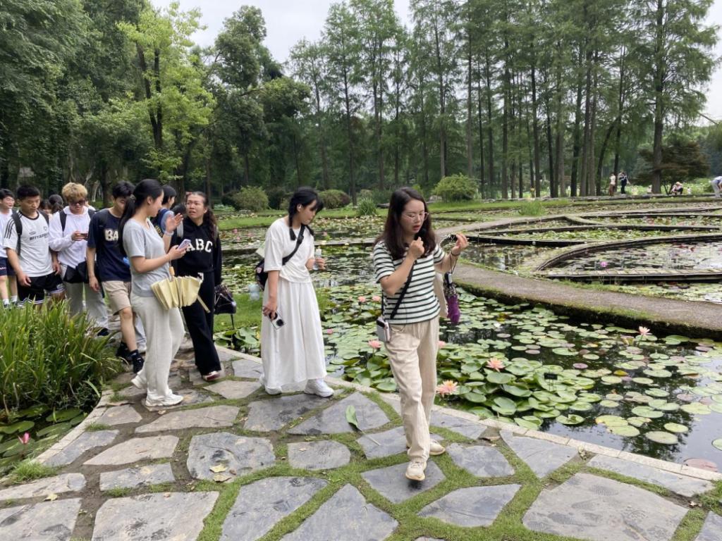 实习首站是武汉植物园,在植物园王兰香老师的引领下,师生参观了景观温室和植物园区。景观温室养设有热带雨林植物,多浆多肉植物和各类奇趣植物展区,王兰香细致讲解每一株植物的名字、科属种、植物独属的特点和用途。从珍稀花卉到常见草木,每一种植物都让学生们惊叹不已。