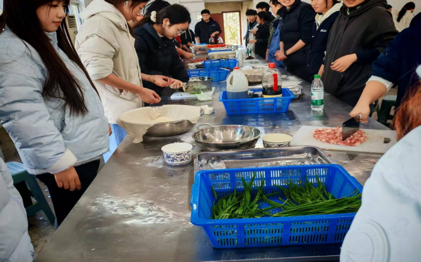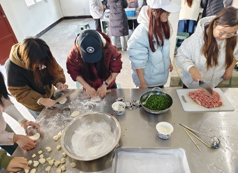 在“我的厨房”与面点制作课堂上,学生们围站在操作台前,手掌按在面团上慢慢推揉,感受着面粉在温水里逐渐变得柔韧有弹性;调馅时,有人小心地往肉馅里加葱花、姜末,有人尝试用筷子顺时针搅拌让馅料更紧实,还有同学拿着擀面杖反复练习,把面皮擀得厚薄均匀。