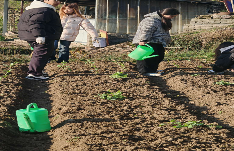 同学们弯腰栽下菜苗,又提着水桶逐棵浇灌,让每一株新苗都“喝”足水分。
